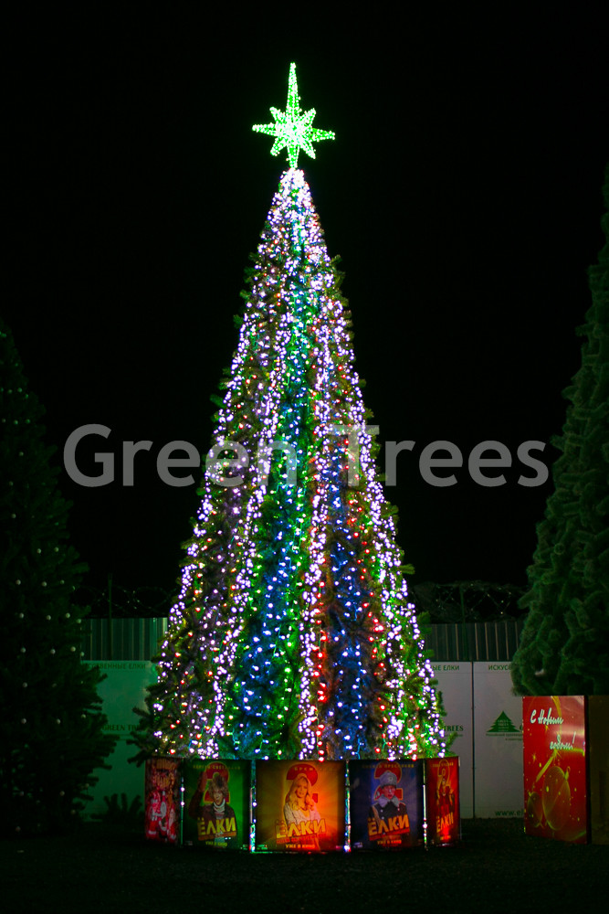 Освещение премиум класса уже с завода вплетается в хвою. Возможно как на каркасных, так и на ствольных елях